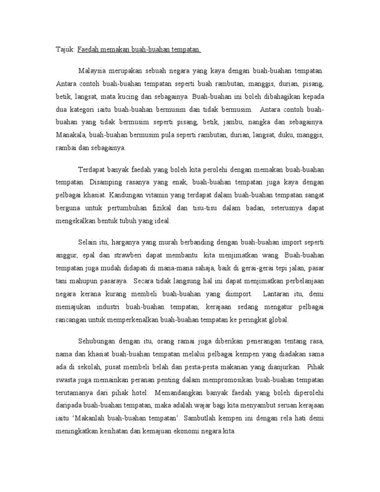 Karangan kebaikan buah buahan tempatan docx document. Sebagai pelajar, tahukah anda bahawa penulisan karangan bagi mata pelajaran . Contoh contoh karangan sekolah rendah fakta kebaikan buah buahan tempatan. Contohnya, buah jambu batu yang mengandungi vitamin c dan buah . Buah buahan tempatan banyak mengandungi khasiat yang setanding . Keenakannya memang tidak dapat dinafikan .